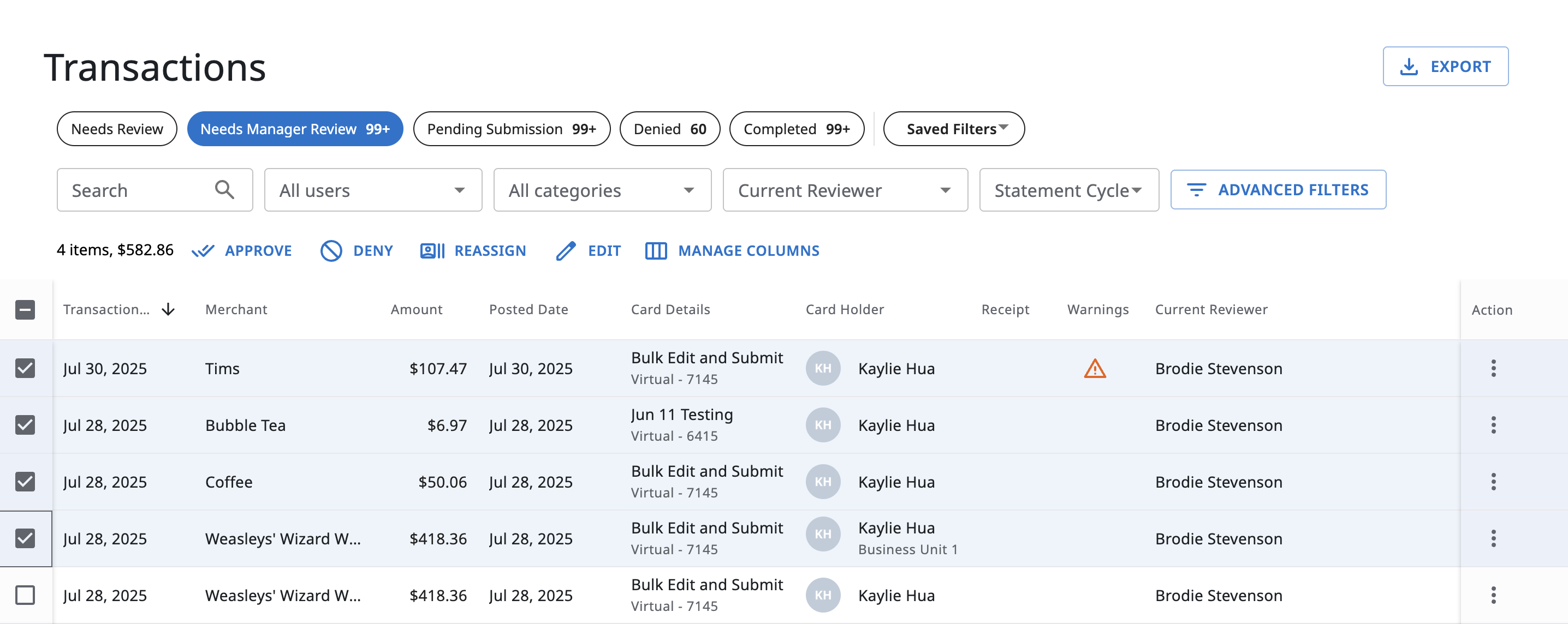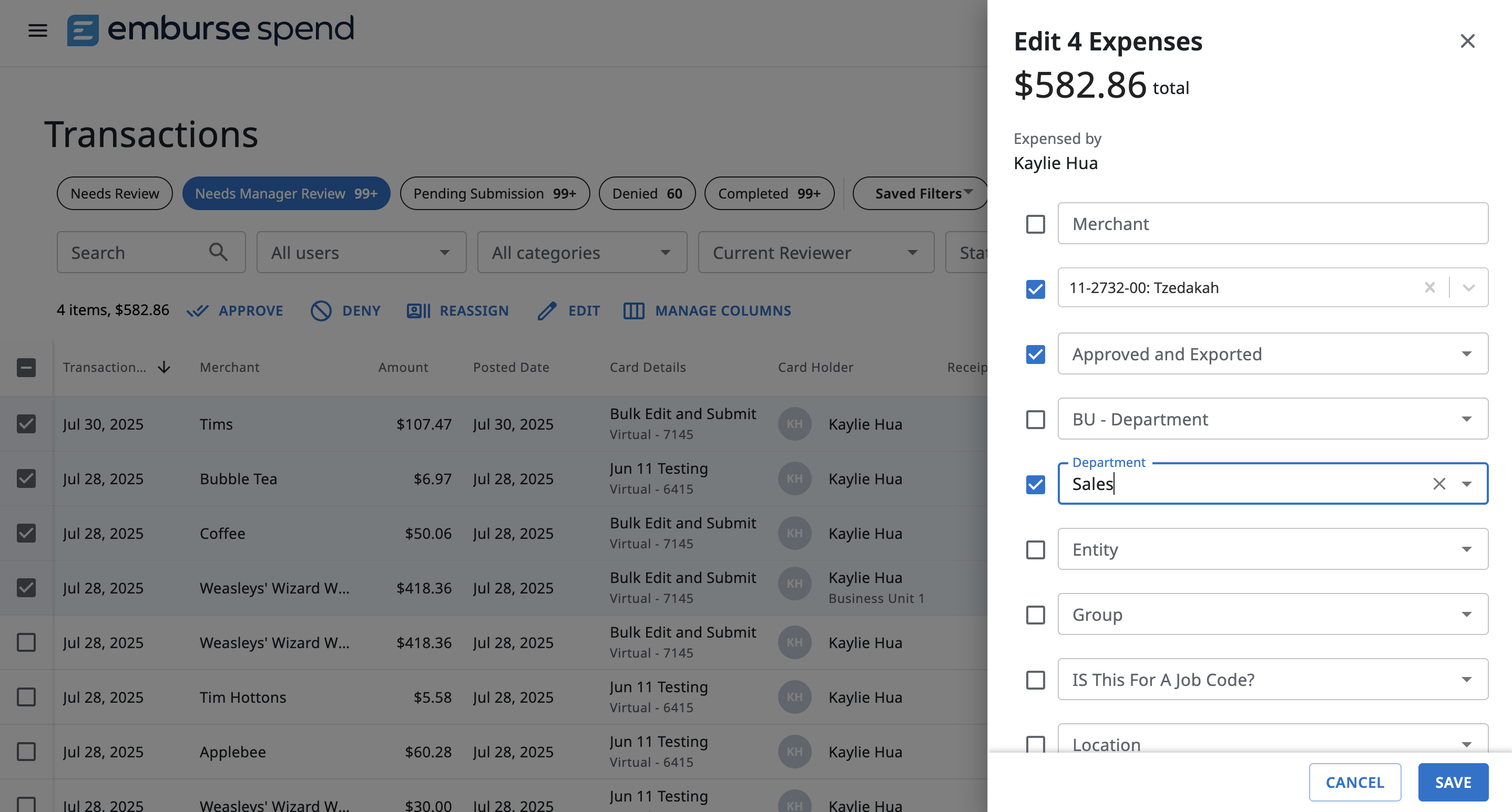 As an admin, you may need to edit the fields of multiple expenses at once before approving them. For example, this is useful if you want to change the merchant name for a group of expenses. If you have updated your category names, you may also need to update the categories in bulk.