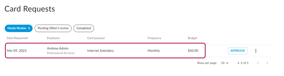 Admins always have full visibility and access to all pending card requests on the Card Requests screen, even if they are pending a manager’s approval.