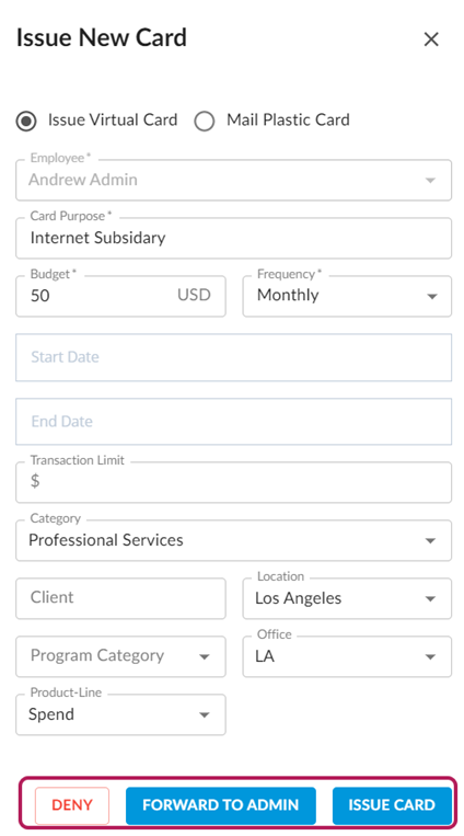 2. You will be redirected to your Emburse Spend account. Once there, fill in any missing card information and click Issue Card.