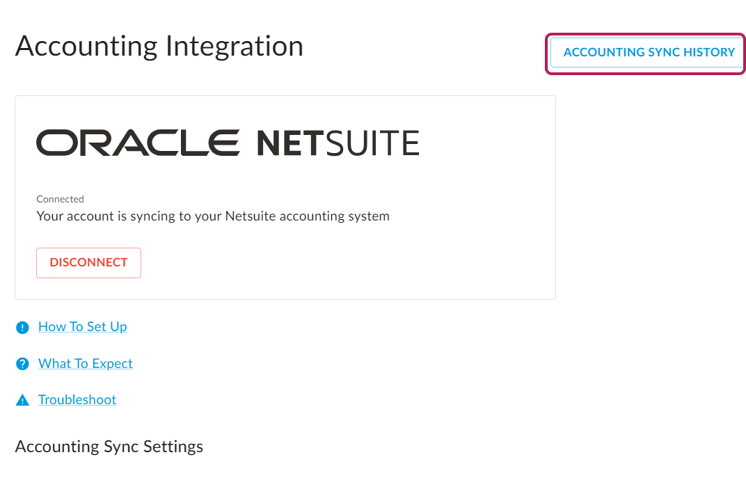 Expense data will be added to the Accounting Sync History screen every time your records are synced into your connected accounting software, which you can view by clicking Accounting Integration on the Company Settings menu.