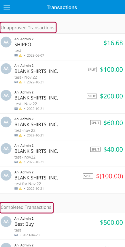 - Completed Transactions: Corporate card expenses that have been returned or have received final approval.