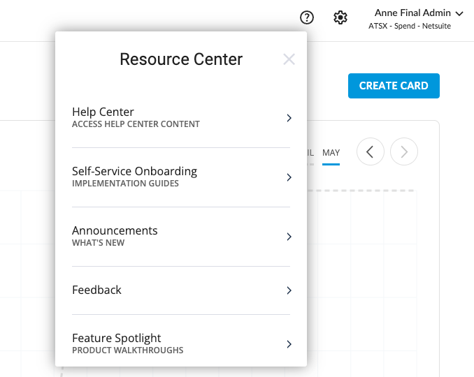 The Question Mark button gives you access to the Help Center, where you can find answers to all your questions about Emburse Spend; Self-Service Onboarding, which contains Emburse Spend's implementation guides; and the opportunity to provide feedback and read about feature updates.