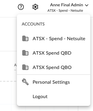 Clicking on your user name opens a drop-down menu from which you may access your Personal Settings or log out of Emburse Spend.