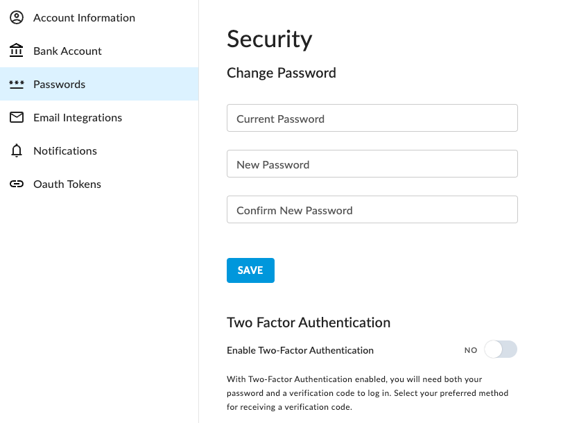 2. The Passwords tab allows you to change your password and enable or disable two-factor authentication for login.