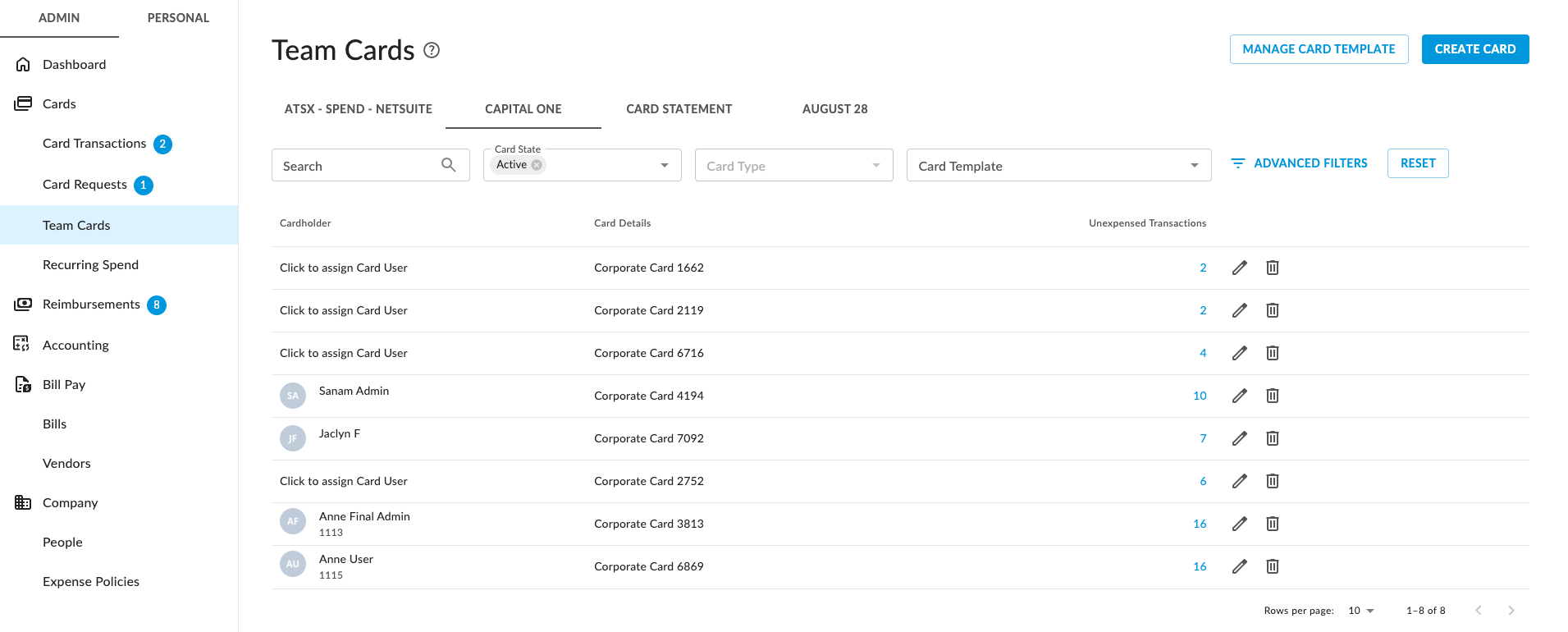 The Team Cards screen allows you to assign or unassign cards to your users. See Assign Corporate Cards to Users for complete details.