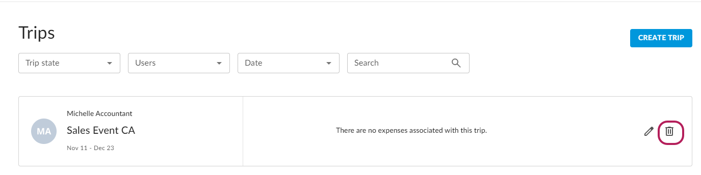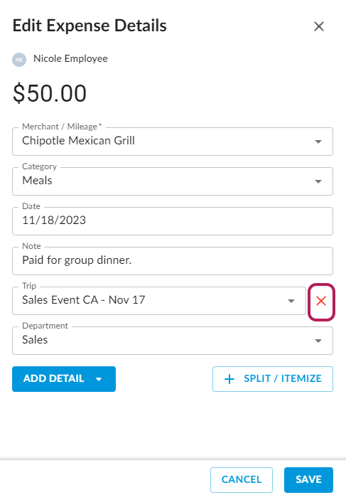 If an expense is erroneously added to a trip, you or your approving admin can remove it by clicking the red X icon.