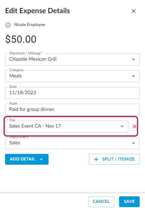 Expenses incurred during the date range of a trip will automatically be added to your trip.