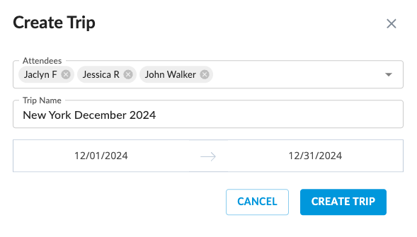 You can create a new trip by clicking the Trips tab and then clicking Create Trip. Only employees are able to create, name, and customize the date range for a new trip.