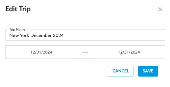 In your Trips tab, navigate to the upper right-hand corner and click on Create Trip. From there, you can name the trip and select the appropriate date range.