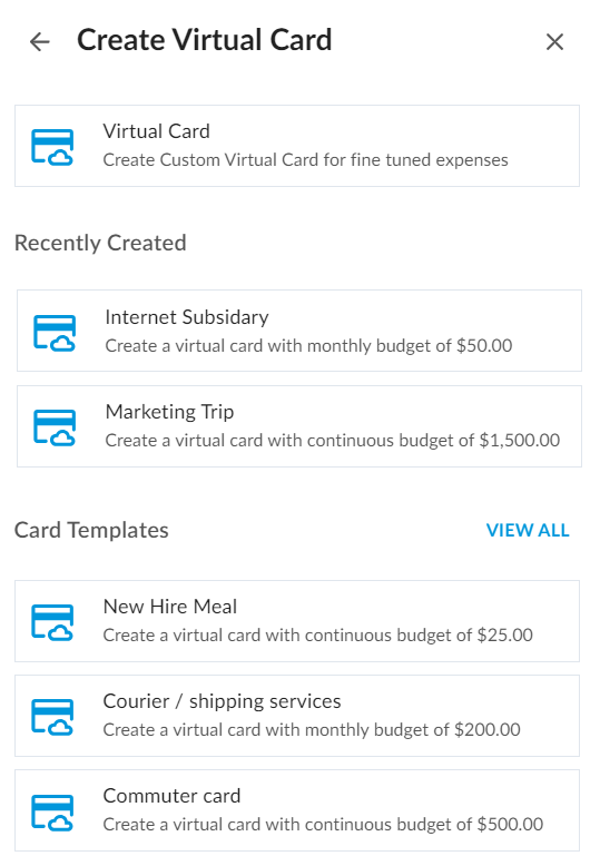 4. Choose from recently created cards if you would like to use them as a starting point, a previously created Card Template, or choose Virtual Card if you would like to start from scratch.