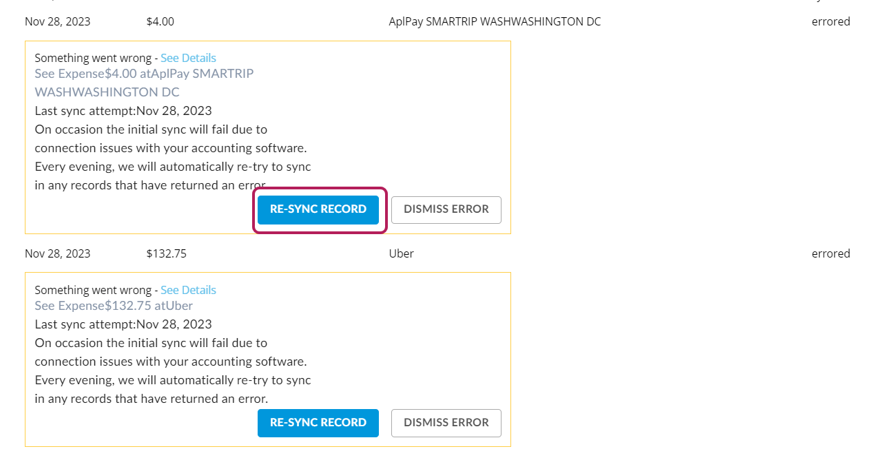 2. If there are any records listed that contain errors, click Re-sync Record next to those that you would like to push through. If you have any trouble syncing them, reach out to Support.