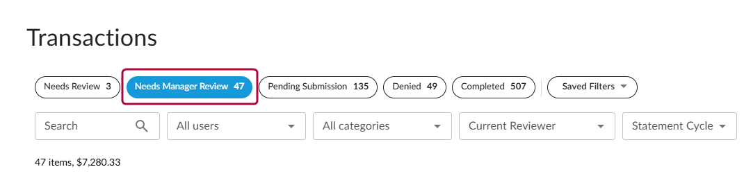 2. Click on the Needs Manager Review tab. If there are expenses listed, review and approve them as necessary. These will be synced to your accounting platform or paid through Spend.