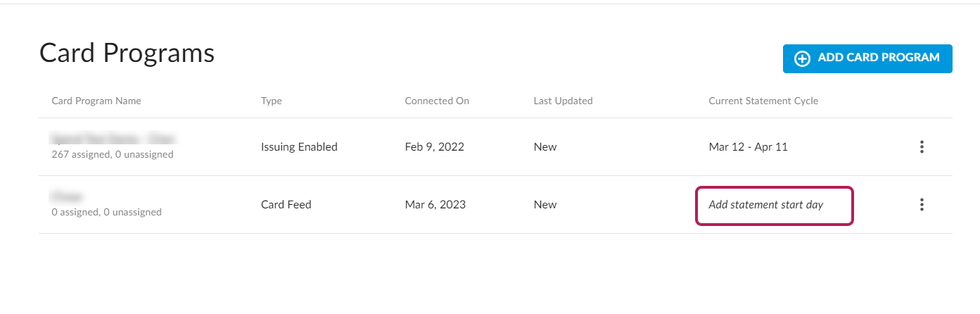 On the Card Programs screen, admins can add a statement start date to all cards in a card program by clicking Add Statement Start Day.