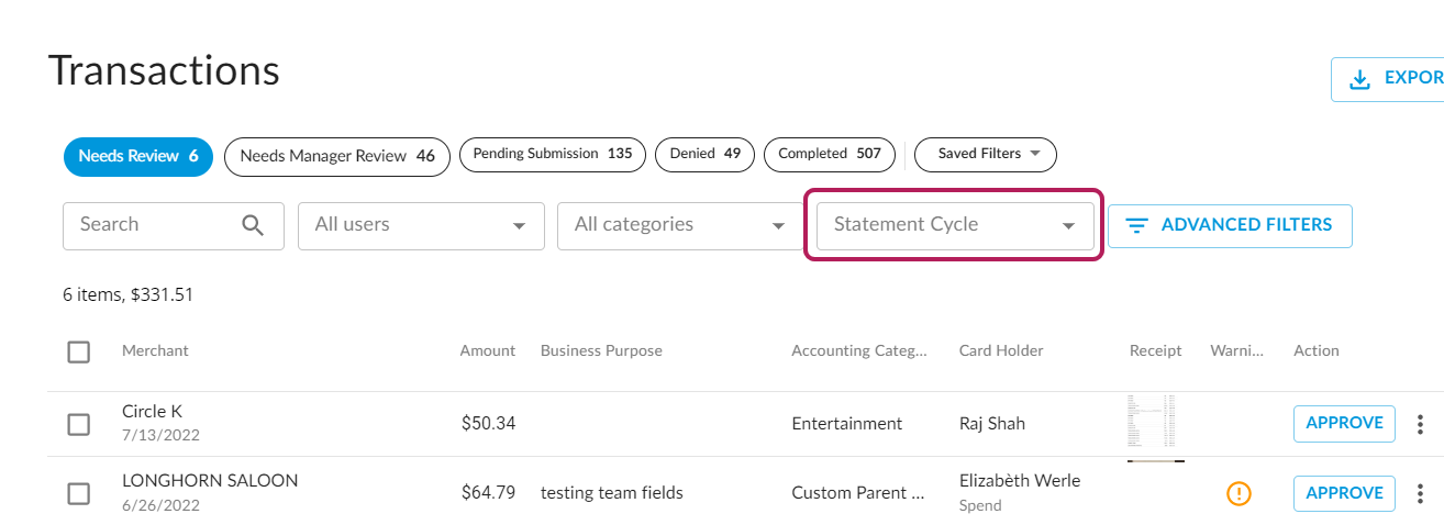 Statement Cycle appears as a filter on the Transactions screen, where admins can use it to easily sort through expenses.