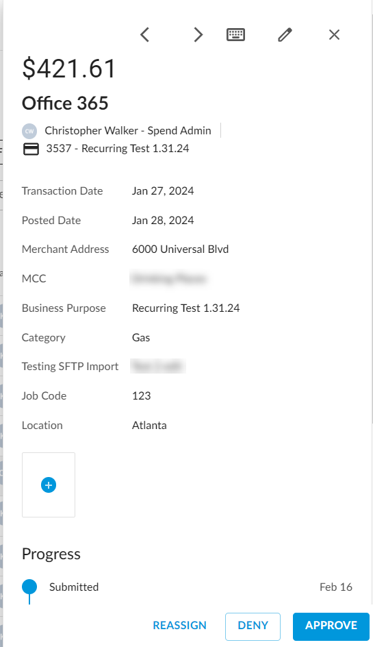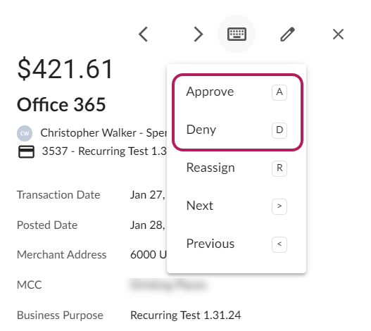 Transactions submitted by end users must be approved by managers, any assigned approvers based on your Approval Routing, and final approving admins in Emburse Spend. You may review and edit, approve, or deny submitted transactions: